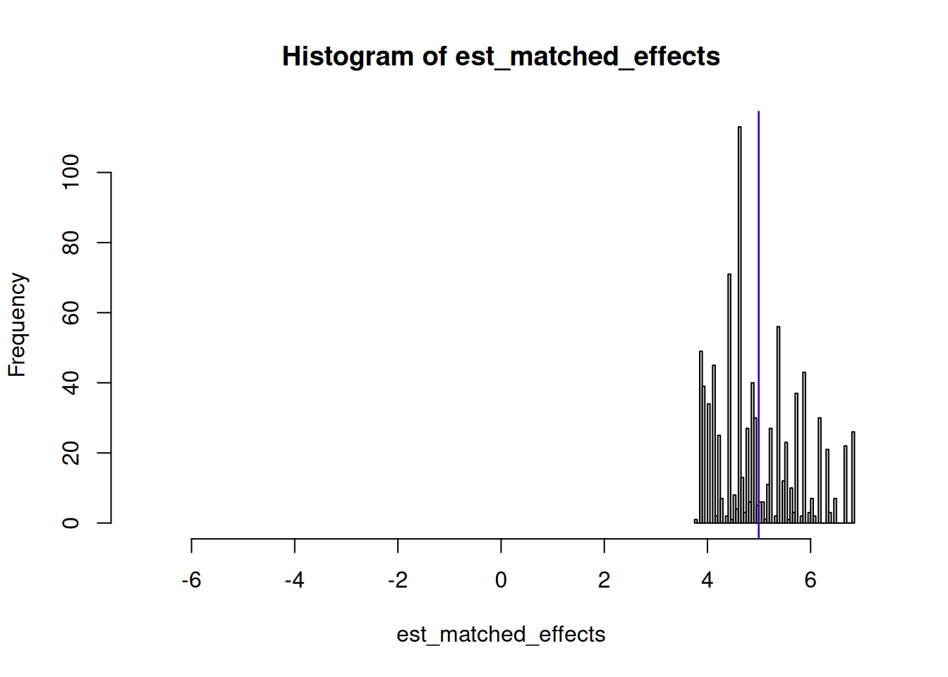 El histograma muestra la distribución muestral del estimador, con el verdadero SATE en rojo y la estimación no ponderada del mismo en azul. El estimador es sesgado: en expectativa, no recuperamos el verdadero SATE, en cambio lo subestimamos. Intuitivamente, uno podría esperar correctamente que el problema esté relacionado con el peso relativo de los grupos en el cálculo del efecto del tratamiento. Sin embargo, en esta situación, tomar la diferencia en el promedio ponderado del resultado entre los grupos tratados y de control no es suficiente para proporcionar un estimador insesgado.
