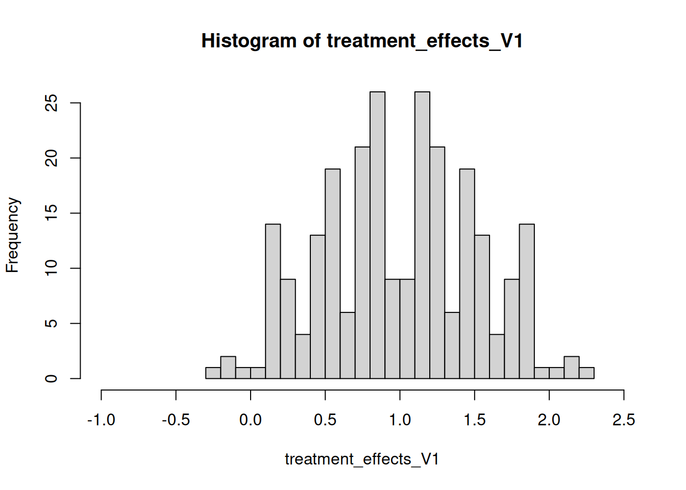 # Version 2 - Cluster randomized# Genere todas las posibles asignaciones de tratamiento# al agrupar por color de cabello (Z)clustered_assignments <-combn(x =unique(hair_color),m =1)# Estimar el efecto del tratamientotreatment_effects_V2 <-sapply(X = clustered_assignments,FUN =function(assignment) { treated_outcomes <- outcome_if_treated[person %in% person[hair_color==assignment]] untreated_outcomes <- outcome_if_untreated[person %in% person[!hair_color==assignment]]mean(treated_outcomes) -mean(untreated_outcomes) } )# Estimar el error estándar realstandard_error_V2 <-sd(treatment_effects_V2)# Graficar el histograma de todos los estimados posible del efecto del tratamientohist(treatment_effects_V2,xlim =c(-1,2.5),breaks =20)
