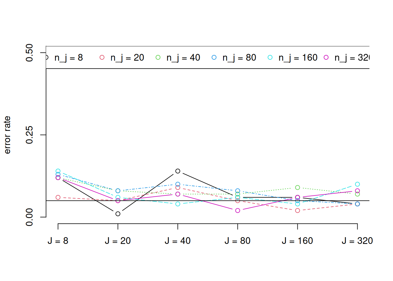 # Grafica el la tasa de error bajo diferentes escenariosmatplot(error_ICC, type =c("b"),pch=1,axes = F,ylim =c(0,.5),ylab ="error rate")axis(side =1,labels =rownames(error_ICC),at =1:7)axis(side =2,at =seq(0,1,.25))abline(h=.05)legend("top", legend =colnames(error_ICC),col =1:2 ,pch=1,horiz =TRUE)