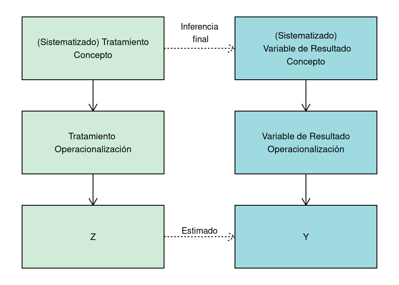 Usualmente usamos experimentos para estimar el efecto causal de un tratamiento, \(Z\), sobre una variable de resultado, \(Y\). Sin embargo, la razón por la que nos preocupamos por estimar este efecto causal es, en principio, para entender las características de la relación entre dos conceptos teóricos sin observar, medidos por las variables observadas \(Z\) y \(Y\).
