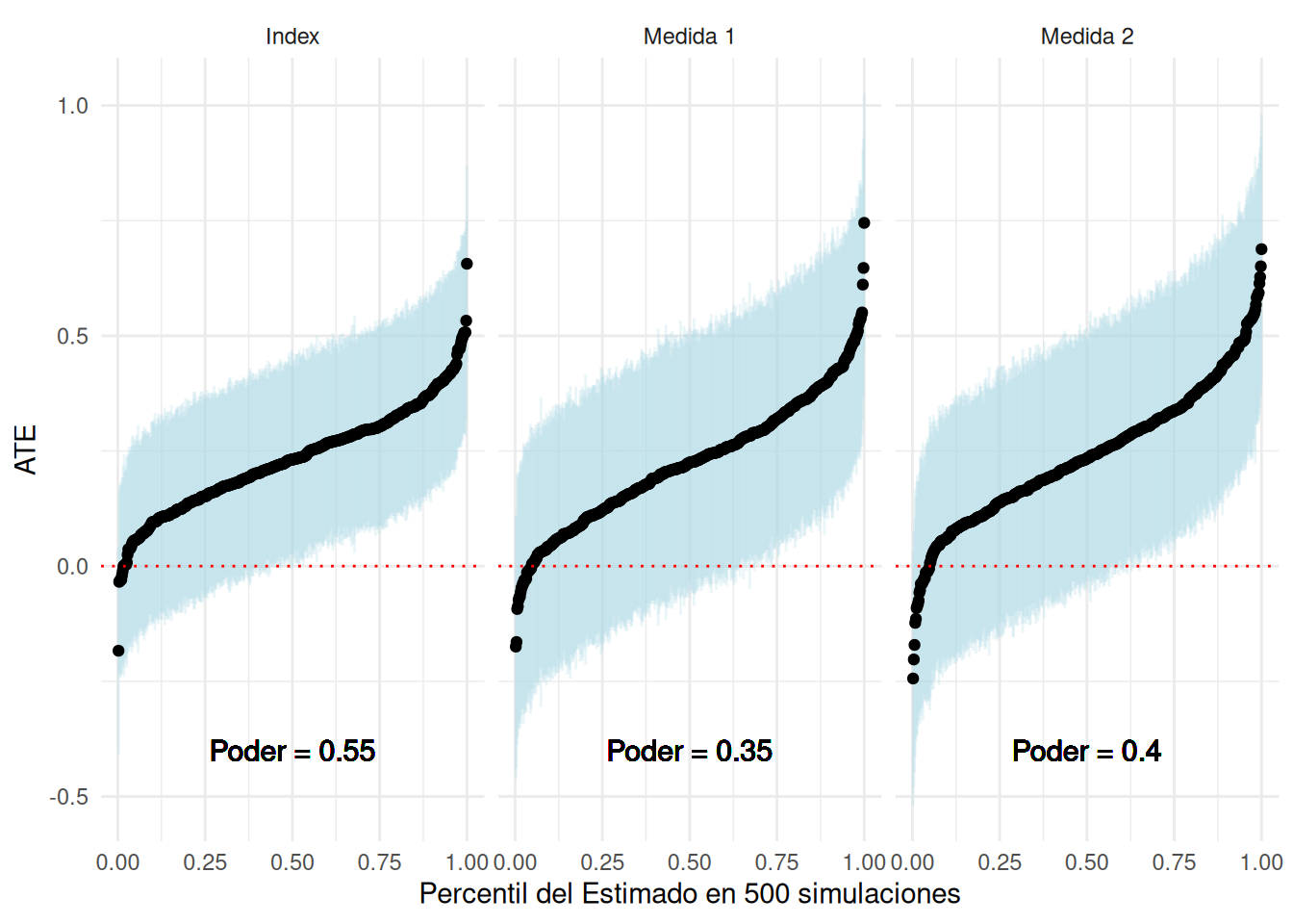 Ahora, considere las implicaciones para el poder. En las simulaciones estimamos el ATE de un tratamiento en la Medida 1, la Medida 2 y el índice. El siguiente gráfico visualiza los estimados. Las líneas azules muestran intervalos de confianza del 95 por ciento. Los intervalos de confianza más pequeños sobre el índice visualizan las ganancias de precisión al aprovechar ambas mediciones. Vemos que esto se manifiesta en un mayor poder estadístico para el experimento.