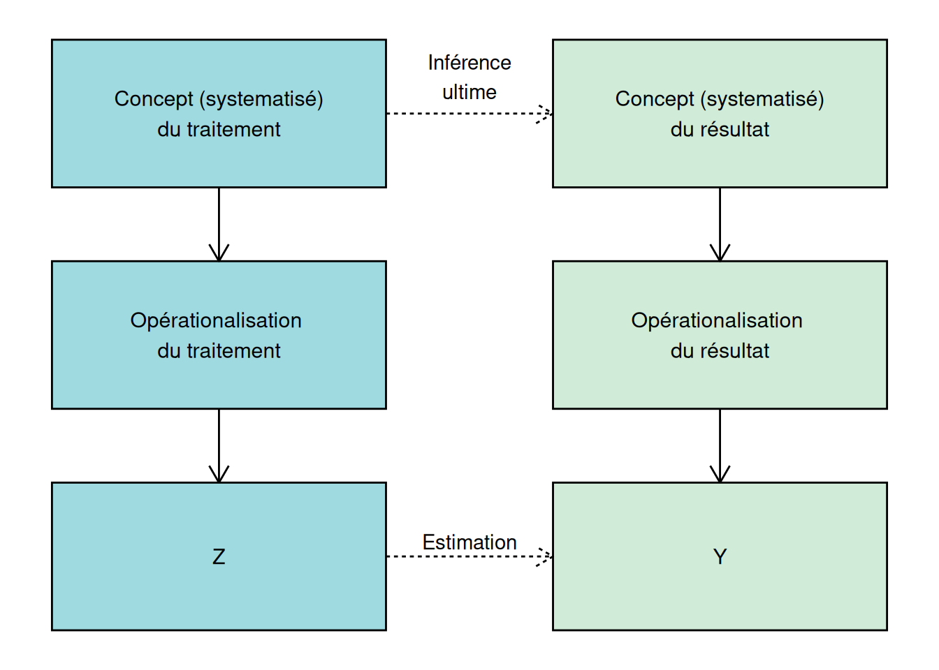 Nous expérimentons généralement afin d’estimer l’effet causal d’un traitement \(Z\) sur un résultat \(Y\). Pourtant, la raison pour laquelle nous nous soucions d’estimer cet effet causal est, en principe, de comprendre les caractéristiques de la relation entre deux concepts théoriques non observés mesurés par les variables observées \(Z\) et \(Y\).