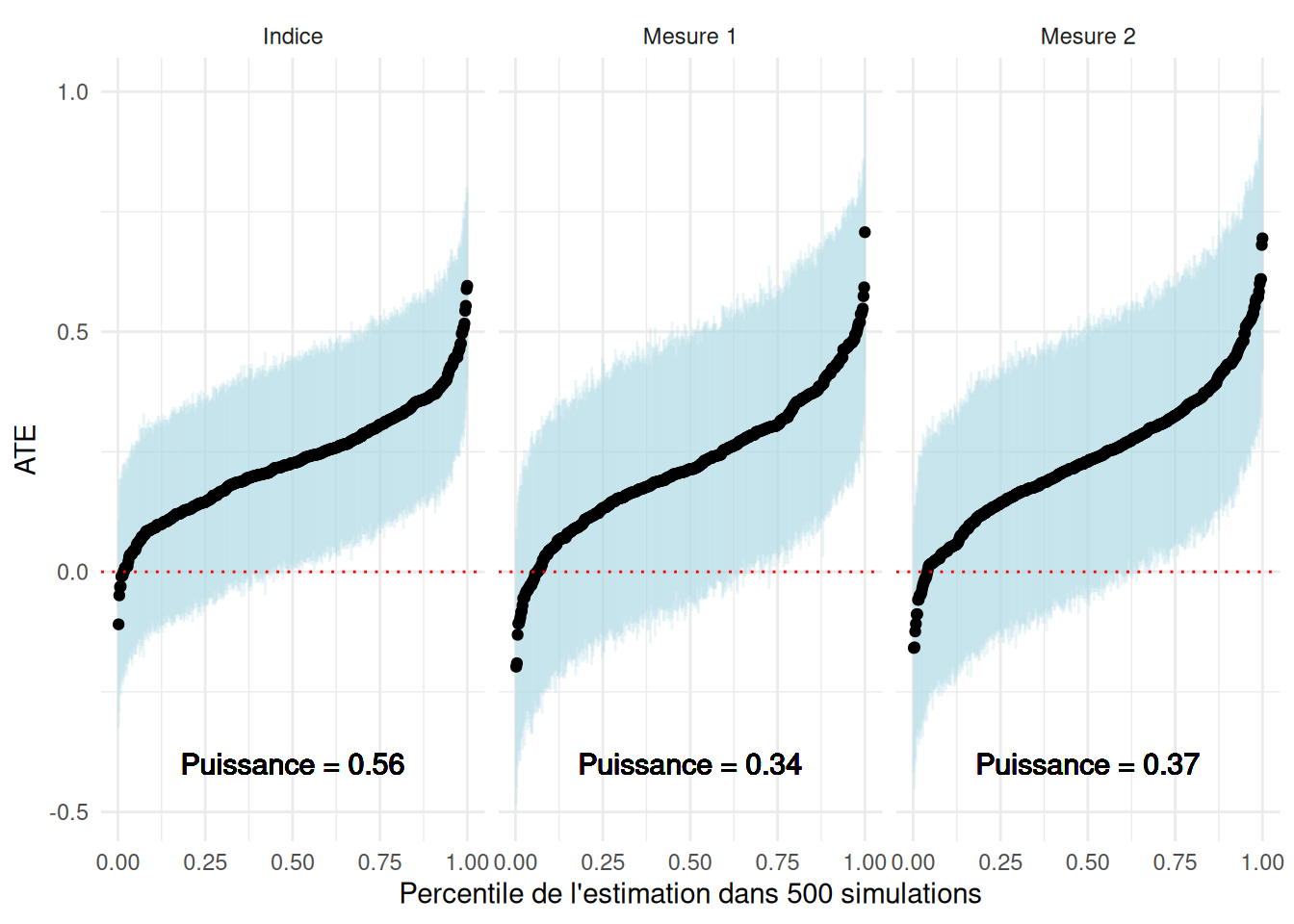 Maintenant, considérons les implications pour la puissance statistique. Dans les simulations, nous estimons l’ATE d’un traitement sur la Mesure 1, la Mesure 2 et l’indice. Le graphique suivant visualise les estimations. Les lignes bleues montrent des intervalles de confiance à 95 %. Les intervalles de confiance plus petits autour l’indice visualisent les gains de précision résultant de l’utilisation des deux mesures. Nous voyons que cela se manifeste par une puissance statistique plus élevée pour l’expérience.