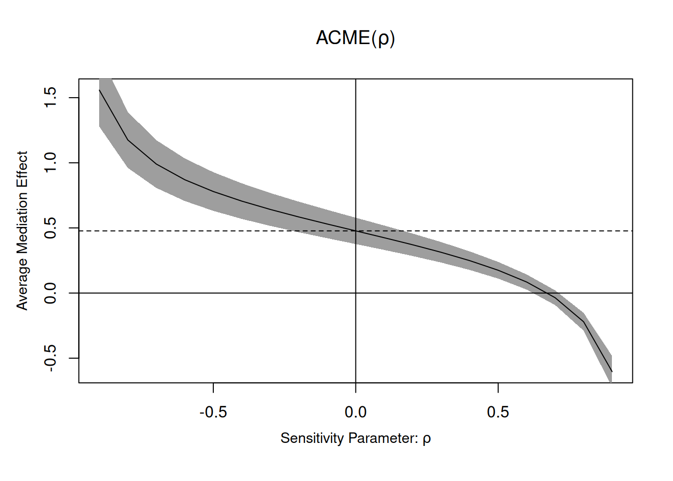 set.seed(1234) # Para replicarn =1000# Tamaño de la muestraY0 =runif(n) # Resultado potencial bajo el controlD =sample((1:n)%%2) # Tratamiento: 1 si tratado, 0 de lo contrarioX<-rnorm(n) # CovariablesM<-rnorm(n=n,mean=D+rnorm(n)) # Mediador influenciado por el tratamientoY1 = Y0 +1+ M # Resultado potencial bajo el tratamientoY = D*Y1 + (1-D)*Y0 # Variable de resultado de la población samp<-data.frame(D,M,Y) library(mediation) med.f<-lm(M~D+X,data=samp) # Modelo para el mediadorout.f<-lm(Y~M+D+X,data=samp) # Modelo para la variable de resultado#Estimado del ACME y el ADE library(mediation) med.out<-mediate(med.f,out.f,treat="D",mediator="M",robustSE=T,sims=1000) # Sensibilidad del ACME a variables que no observadas que # pueden generar distorsións.out<-medsens(med.out) plot(s.out) # Grafica limites de sensibilidad