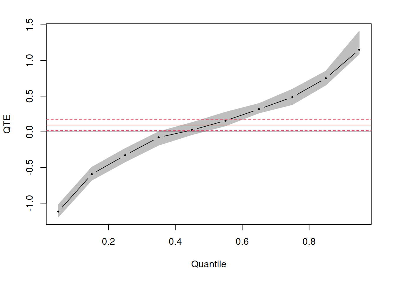Si ces hypothèses sont justifiées pour nos données, nous pouvons obtenir des estimations cohérentes de l’effet du traitement par quantile (quantile treatment effect, QTE) en utilisant la régression par quantile.19 Tout comme la régression linéaire estime l’ATE comme une différence des moyennes (ou, lorsque des covariables sont utilisées dans le modèle, à partir d’une moyenne conditionnelle), la régression par quantile ajuste un modèle linéaire à un quantile conditionnel et ce modèle peut ensuite être utilisé pour estimer l’effet du traitement pour ce quantile particulier du résultat. L’approche peut être étendue pour inclure des covariables et des instruments de non-conformité. Notez que l’interprétation du QTE est pour un quantile donné, non pas pour un individu de ce quantile.